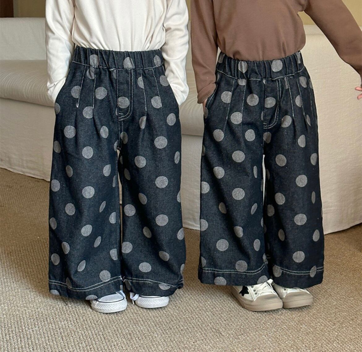 【80cm-150cm】ワイドデニムパンツ/ドッド柄